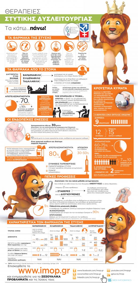 Το 1982 ο Γάλλος γιατρός R. Virag ανακοίνωσε ότι η ένεση παπαβερίνης μέσα στο πέος προκαλεί στύση, αυξάνοντας άμεσα τη ροή του αίματος στο πέος. Έτσι άρχισε να ανοίγει ο δρόμος για την φαρμακευτική αντιμετώπιση της στυτικής δυσλειτουργίας. Το πρώτο φάρμακο που κυκλοφόρησε ήταν η ενέσιμη προσταγλαδίνη Ε1, αλλά η πραγματική επανάσταση έγινε το 1998 με την κυκλοφορία της σιλδεναφίλης σε μορφή χαπιού από το στόμα. Λίγα χρόνια αργότερα, το 2003, κυκλοφόρησαν άλλες δύο ουσίες με την ίδια ένδειξη, η ταδαλαφίλη και η βαρδεναφίλη.  Τα φάρμακα αυτά αποδεδειγμένα βοηθούν στην αντιμετώπιση της στυτικής δυσλειτουργίας και χορηγούνται ΜΟΝΟ ΜΕ ΙΑΤΡΙΚΗ ΣΥΝΤΑΓΗ”. Αυτά επισημαίνει στο πρόλογό του ο κ. Δημήτρης Χατζηχρήστου, καθηγητής Ουρολογίας του Α.Π.Θ. και πρόεδρος του Ινστιτούτου Μελέτης Ουρολογικών Παθήσεων, προκειμένου να εισηγηθεί το νέο πληροφοριακό γράφημα του ΙΜΟΠ με τίτλο «τα κάτω…πάνω».